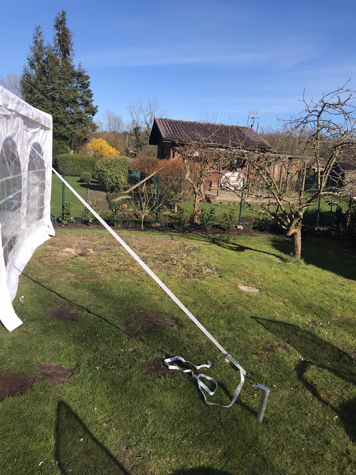 Zum Sichern des aufgebauten Zeltes empfehlen wir Ihnen das Befestigungsset mit 4 stabilen Erdnägeln und Spanngurten.
